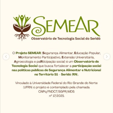 O Projeto SEMEAR nasce com o objetivo de fortalecer a participação social nas políticas públicas de Segurança Alimentar e Nutricional no Seridó (RN), articulando pesquisa, extensão universitária e monitoramento participativo.